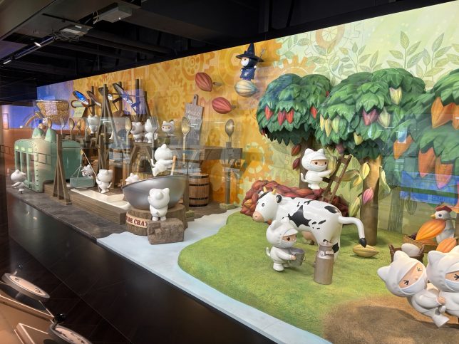 工場見学して、カフェの明るい窓側の席で、時計塔を眺めながらロールケーキでおやつタイム。